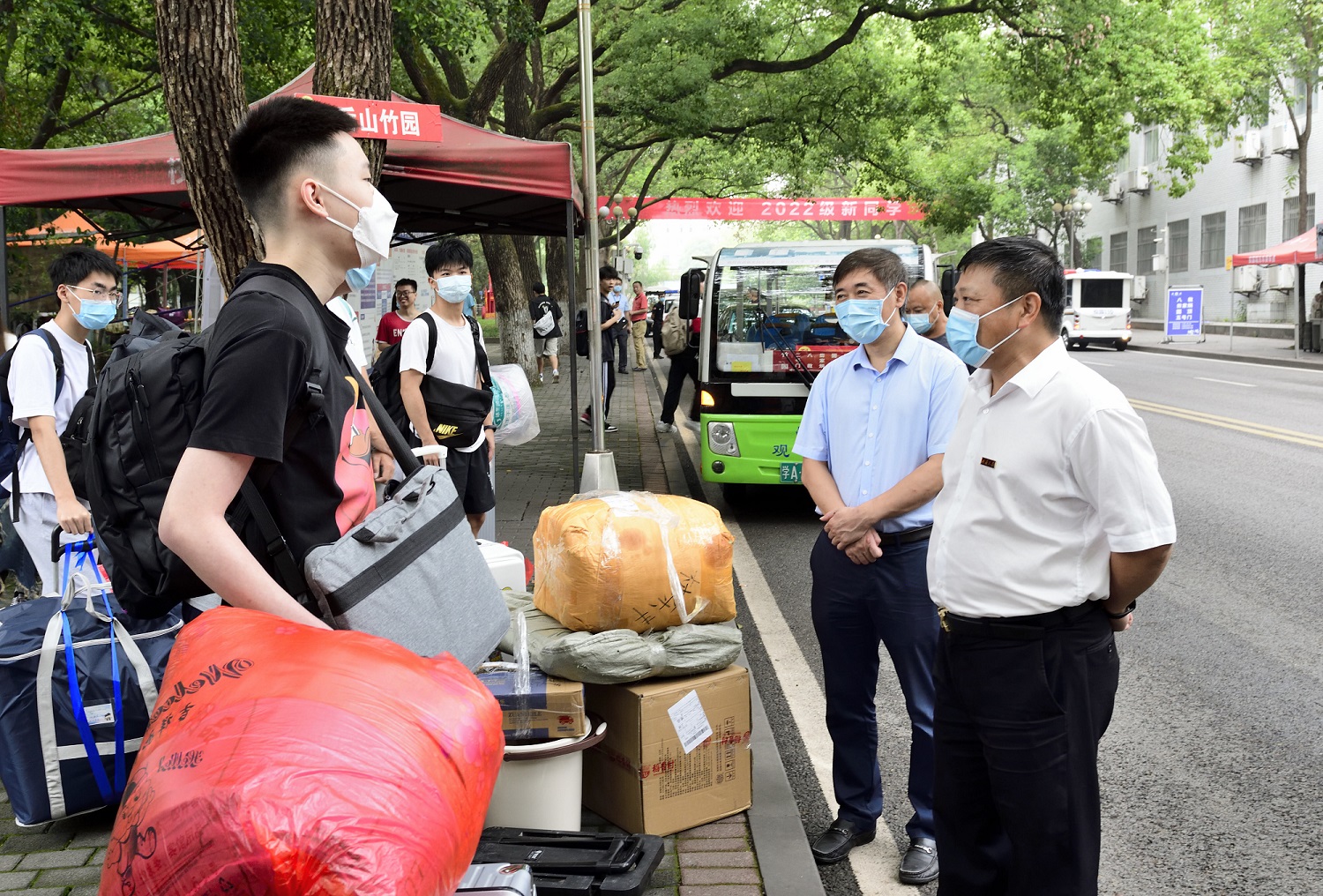 新生报到期间,学校党委书记李旭锋校长张卫国前往校门、校内交通流转点、学生生活园区等地,亲切慰问迎新工作人员和师生志愿者,认真检查指导各项迎新工作开展情况叮嘱大家严格落实疫情防控要求尽可能为新生提供周到的服务保障,确保新生安全有序进校,快速融入校园生活。李旭锋、张卫国在迎新现场与新生亲切交流,详细了解新生入校安顿等情况,鼓励大家尽快适应大学生活,努力勤学奋进,励志成长成才。