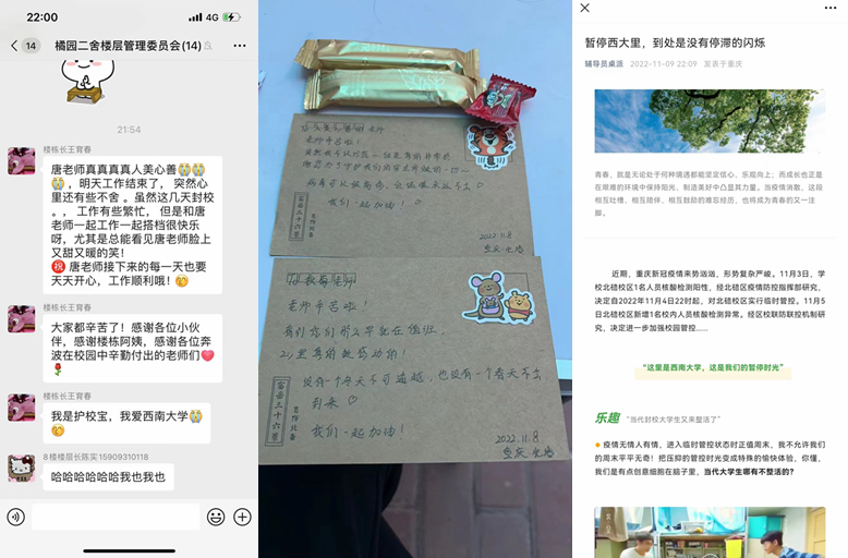 面对突如其来的疫情,学校党委书记李旭锋、校长张卫国最是牵挂着5万多学生的身心健康和生活保障,多次反复讨论研究防控措施细节,多次敦促落实生活物资保障,多次实地查看食堂、宿舍和核酸检测现场,全体校领导下沉片区督促指导,各学院(部)主要负责人逆行驻校、坚守一线。学工系统迅速响应,在学校疫情防控指挥部的领导下,将抗疫与暖心并举、防疫与育人结合,用心用情,坚持坚守,牢牢守护学生生命安全和身体健康,积极应对疫情大考。