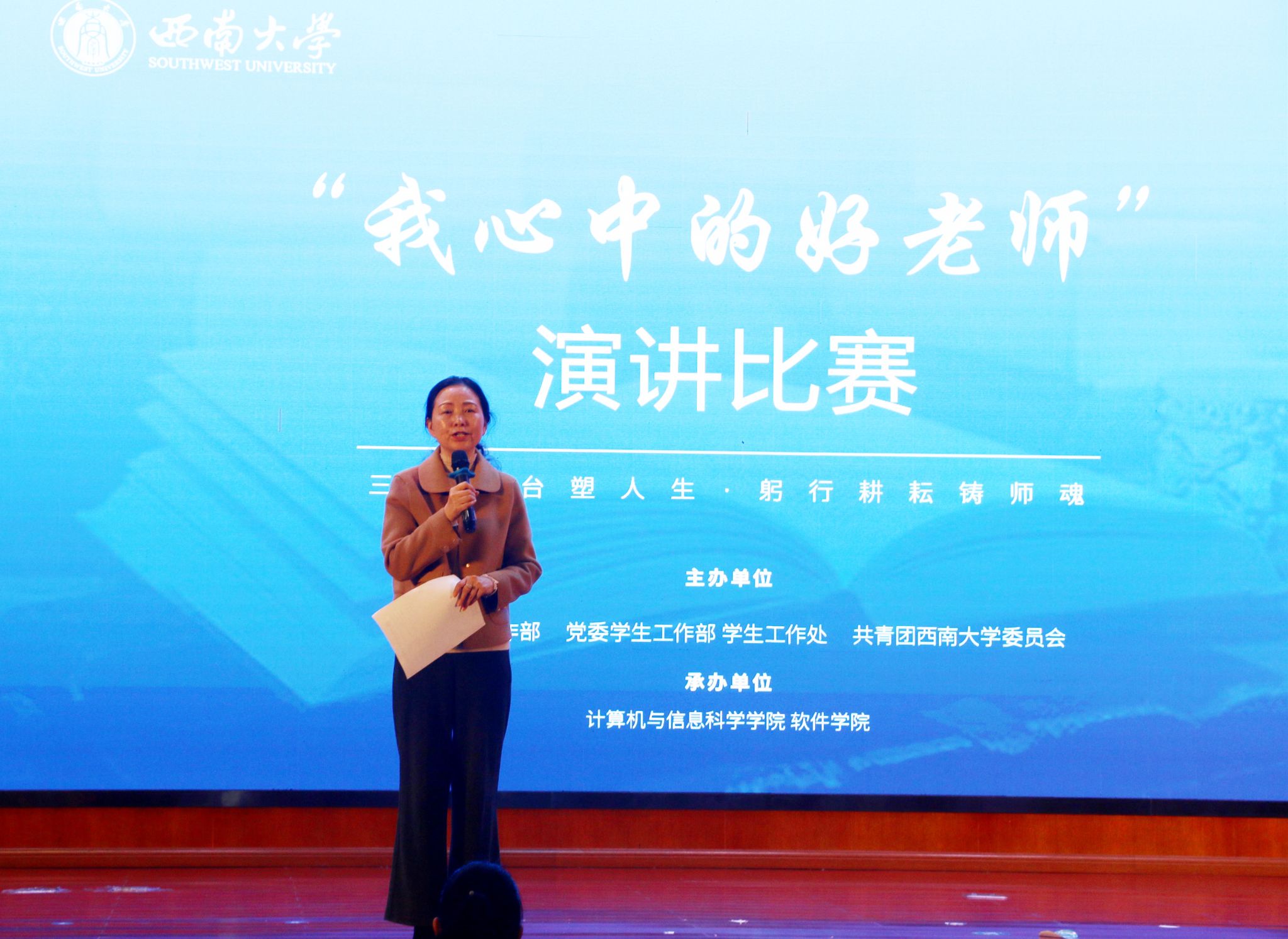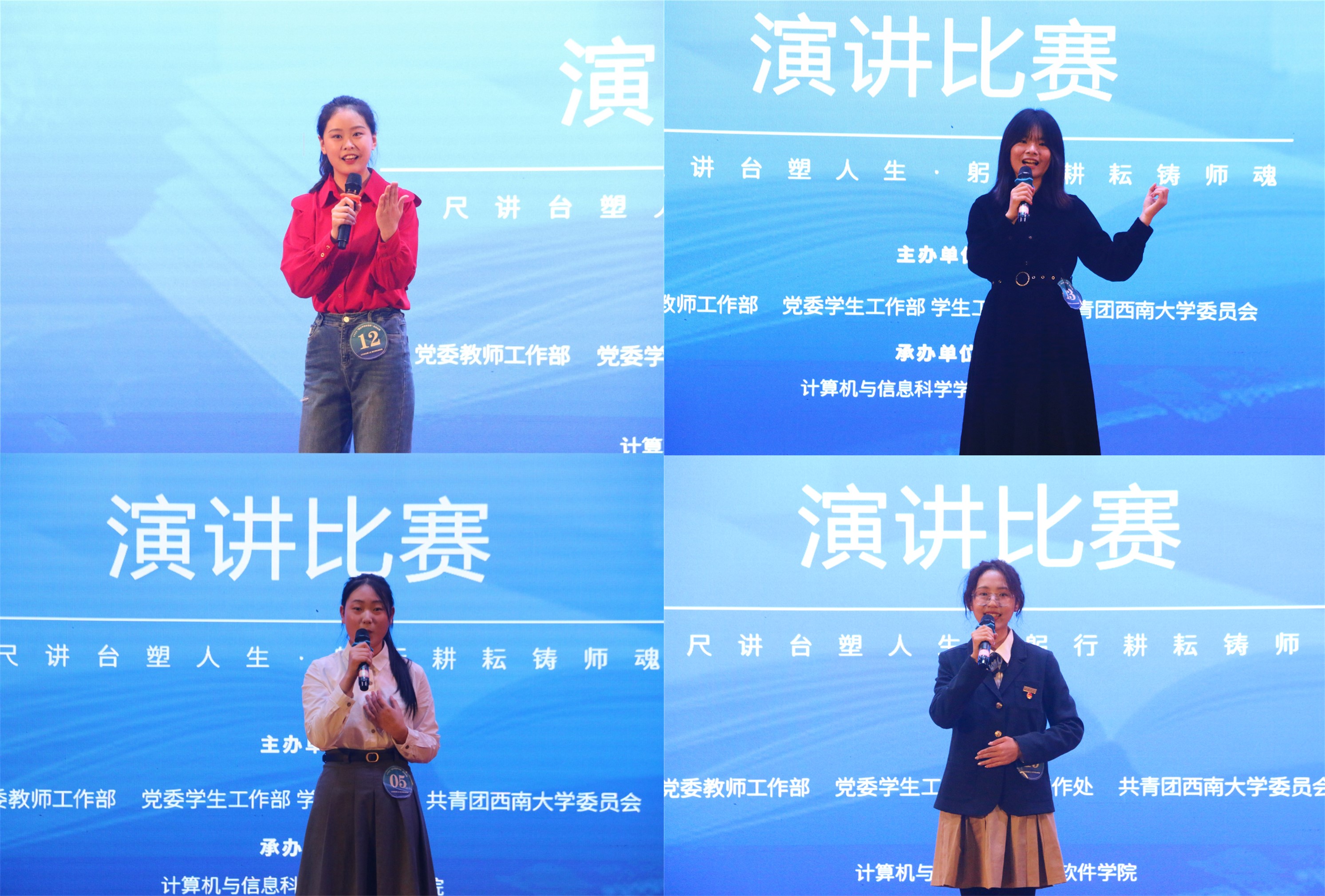 此次比赛是从学生的视角展示新时代西大教师爱岗敬业、无私奉献、开拓创新精神风范的一次成功实践。参赛选手结合亲身经历和感悟,以生动、形象的语言勾勒了自己心中好老师的模样,用真挚的情感抒发了他们对好老师的敬爱,用可亲可敬的教师事迹诠释了西大教师为教育事业奋斗终身的无私情怀。