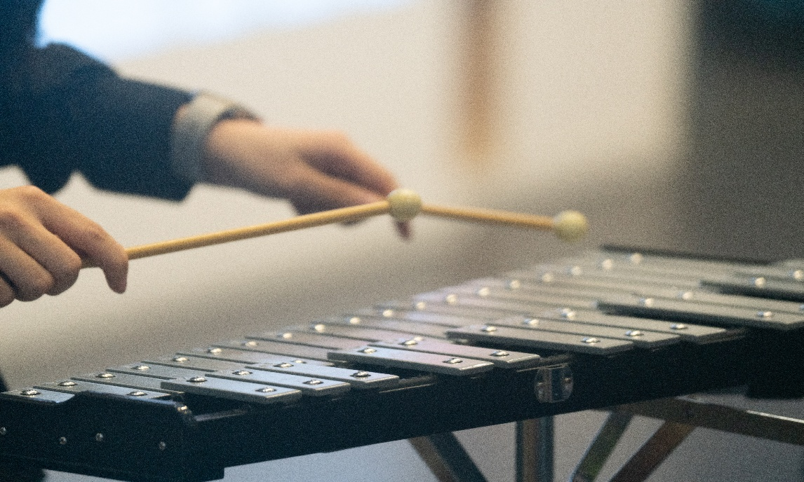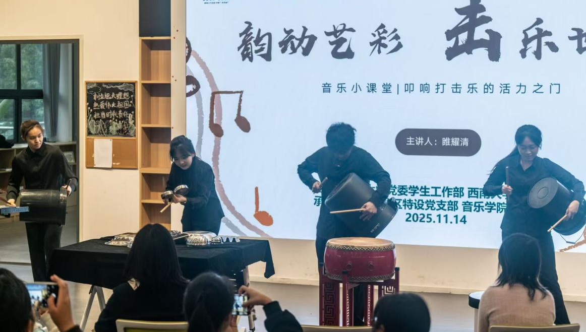 活动现场,音乐学院2023级睢耀清同学以轻松有趣的方式,带领大家“穿越”千年,感受打击乐作为“人类最早乐器”的奇妙演变,领略中国古代“八音”分类法的深厚文化内涵。接下来,音乐学院的同学们轮番上阵,利用钢片琴、绛州鼓、箱鼓等打击乐器,演奏了《天空之城》《破铜烂铁》《滚核桃》《冲天炮》《守》等曲目,赢得现场阵阵掌声。最后,同学们在演奏者的指导下,还分组尝试了打击乐器的分声部演奏,近距离感受节奏的魅力与协作的乐趣。