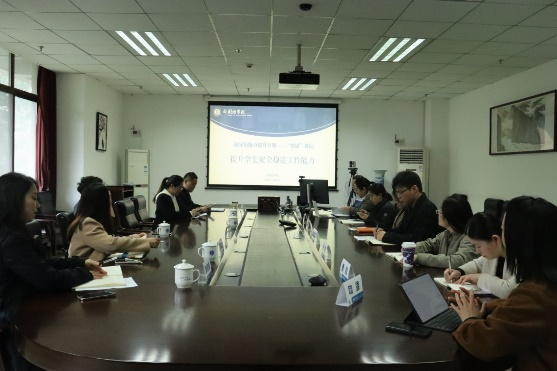 3月7日下午,外国语学院辅导员能力提升计划之“覃思”讲坛在学院313会议室举行。围绕“提升学生安全稳定工作能力”主题,党委宣传部副部长、党委网络工作部副部长吴靖,党委学生工作部副部长、学生工作处副处长、武装部副部长武宇坤,党委学生工作部副部长、学生工作处副处长、大学生心理健康教育与服务中心主任谢沁怡,党委保卫部副部长、保卫部处副处长杨进应邀莅临指导,学院纪委书记、党委副书记李晓畅,党委副书记梅胜利以及全体专兼职辅导员参加活动。