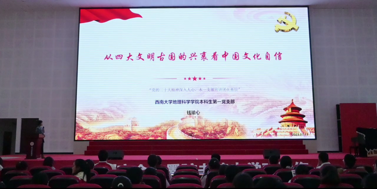 春节过后,迎来了各地学校开学的日子,北极星志愿服务队的学生党员任秋帆、钱瑜心、刘嘉慧走进校园,为当地中小学生们带来了一堂特别的“开学第一课”。2月16日,钱瑜心来到大理市金秋墨弦书院中学开展了“学习二十大精神·铸牢中华民族共同体意识”主题团课活动。通过介绍四大文明古国历史发展演变,带领学生们沉浸式体验和理解中国文化,增强文化自信。课堂上,钱瑜心以丰富的史料和生动的案例向共青团员展示了中华文明的博大精深和中华民族的“根”和“魂”,不断提升团员们的价值认同。