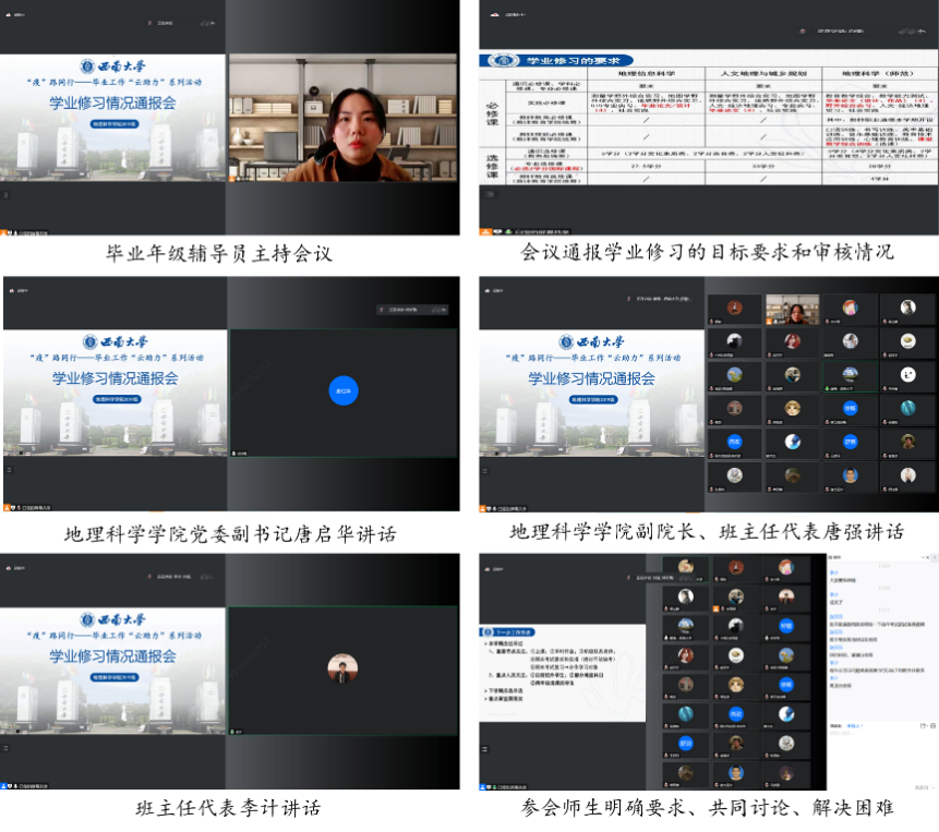 四级贯通“云审核”。健全“学院—年级—班级—个人”学业修习情况“云审核”机制,扎实推进学生毕业要求的达成。学院层面宣讲和解析培养方案,明确培养要求;年级依照培养方案,定期清算通报;班级实时对点跟踪,一对一加强信息沟通;个人落实学业责任,积极查漏补缺。11月25日,学院召开了副书记、副院长、辅导员、班主任、主要班委和必修课应过未过学生共同参加的“云端”学业修习情况通报会,与会师生明要求、找差距、抓落实。学院党委副书记唐启华强调,每一位同学都是自己学业的第一责任人,学院将会尽可能为大家提供帮助,保证疫情期间的毕业工作推进。学院副院长唐强结合当前学业修习情况对参会学生提出殷切希望,班主任代表李计从个人学习经验出发进行了学业指导。