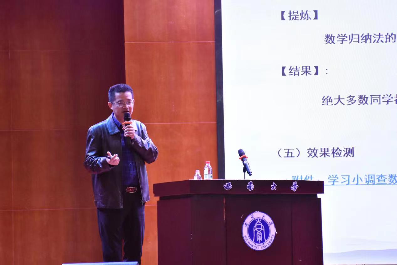 党忠良院长以“基于促进学生理解数学本质的高中数学课堂教学设计研究”为题,从“数学归纳法”的课堂观察出发,提出了高中数学教学应促进学生理解数学的本质,并根据所带领课题组的实践研究成果,介绍了基于促进学生理解数学本质的高中数学课堂教学设计策略与途径。党院长指出,教学具有整体性,蕴含着以“事实——方法——方法论——数学学科本质观”为主要内容的暗线,发挥暗线作用的育人价值,使得数学归纳法的抽象思想变得具体化,能让学生切实感受到、体验到,从而增强其“可意会性”,这是一件更加诱人更具挑战性的工作。他还展示了七条有助于学生理解高中数学概念本质的策略,帮助师范生有效理解高中数学教学中的基本概念。