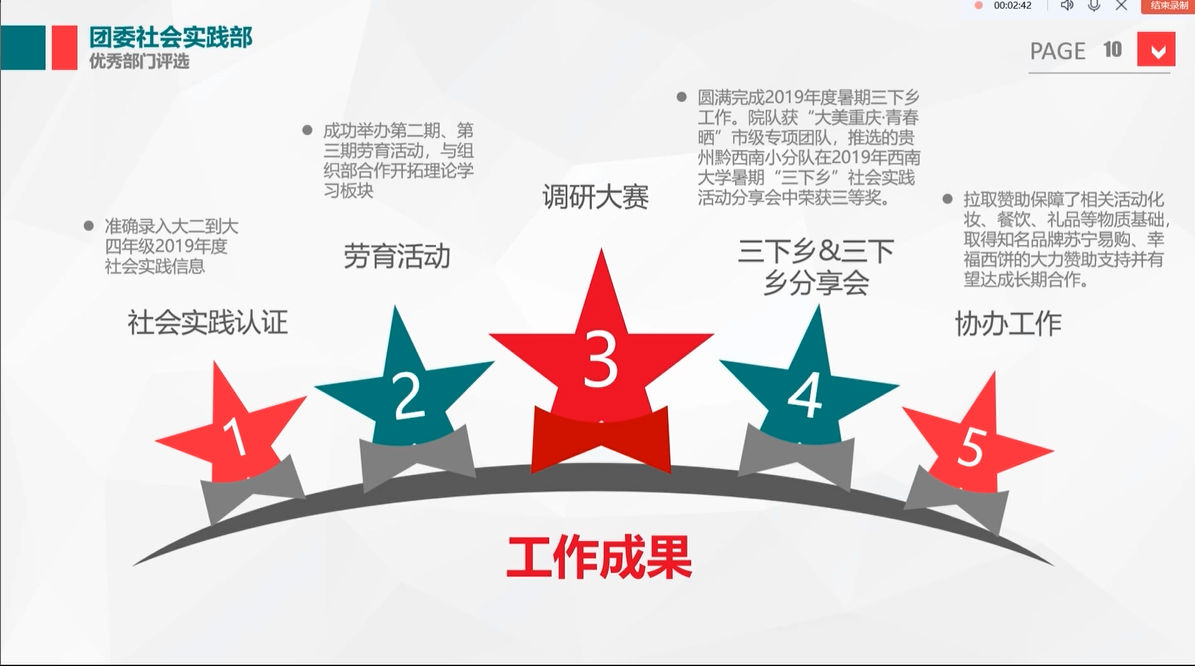 团委新媒体中心首先展示了他们的部门风采。打造独具生科特色的微信公众平台,紧跟疫情时事、开设疫情特辑,他们摆出大量数据展现他们一年以来的努力。一张张精美的海报、一个个漂亮的展板,一个个精致的道具,都承载着团委宣传部的心血,体现了他们为同学服务的极高热情。成员们从最初的零基础,到最后都能熟练运用技术做出精美的海报展板,见证了他们在这温暖的大家庭中不断成长、不断创新,并为其注入新鲜活力。综合办公室在顾全大局的同时也不放过任何一个细节,作为部门间的枢纽,充分发挥监督和保障功能,成为“学院-学生会-班级”之间沟通的重要桥梁。在这充实的一年中,团委社会实践部也寻找到属于自己的发展方向:将轻松友爱的部门氛围和不断地反思总结融入到日常工作中,使他们在劳育活动、调研大赛以及三下乡等活动中取得更加优异的成绩,赢得了大家的点赞。