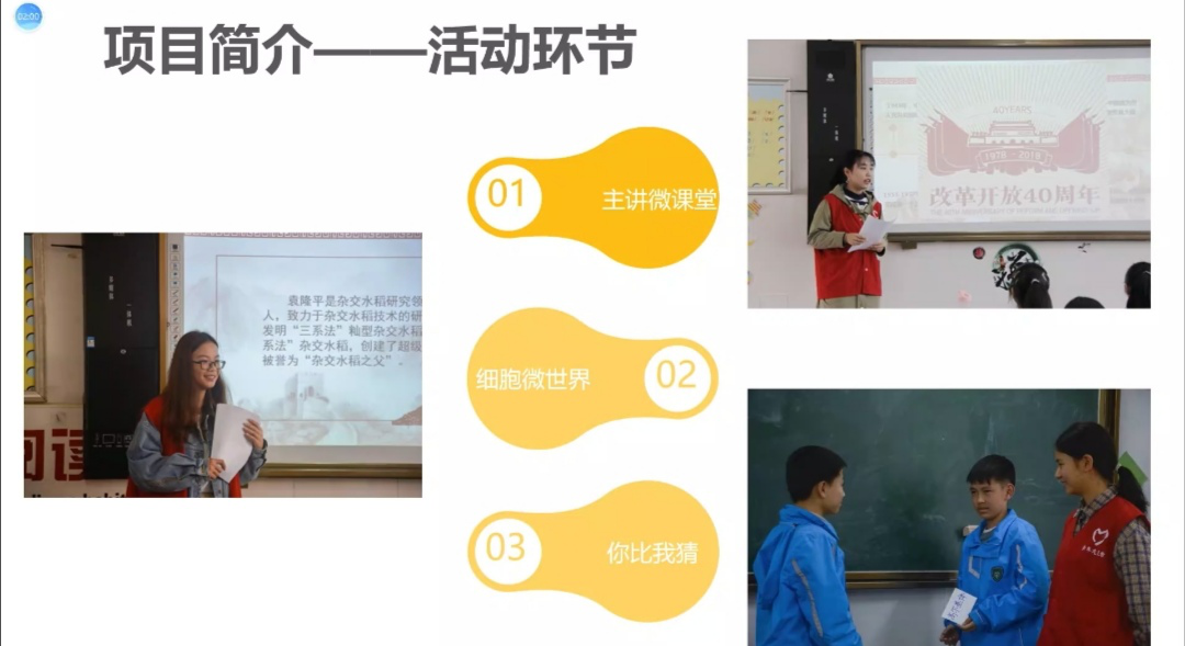 首先开展的是“年度示范性项目”评选。主持人宣读完规则后,团委志愿者工作部率先展示,所开展的“ 追梦学子,携手同行”系列活动,不仅给身为师范生的志愿者提供了更多的锻炼机会,也丰富了天府中学的学子们的知识,给他们带去更好的学习体验。