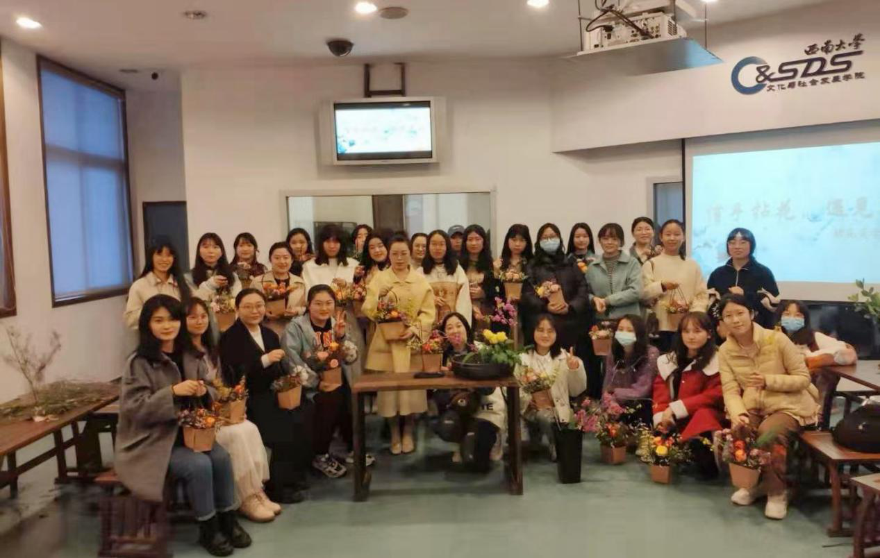 至此,本次女生节插花美学沙龙活动圆满结束。插花艺术历史悠久,千年风雅韵味无穷。本次活动的成功开展体现了我院整合校内外资源,发挥已有的生活艺术教育传统优势,积极探索构建以审美和人文素养培养为核心、以中华优秀传统文化传承发展和艺术经典教育为主要内容的新文科美育课堂。相信同学们通过学习插花文化,可得一室芬芳、品一心欢愉,将在一花一叶的修炼中遇见更好的自己。