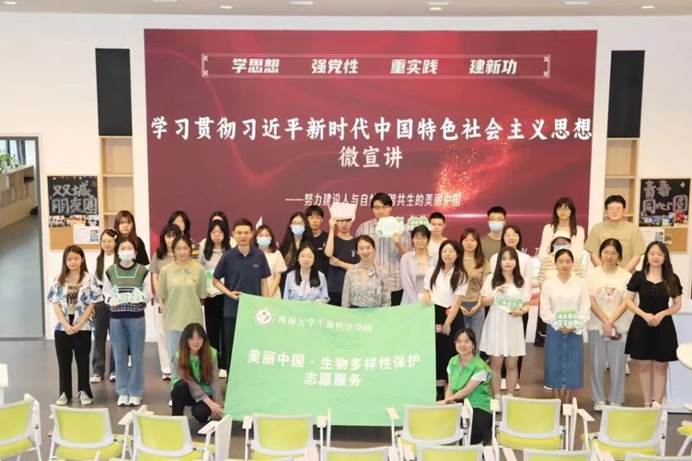 为深入学习宣传贯彻党的二十大精神,认真贯彻落实党中央决策部署,牢牢把握“学思想、强党性、重实践、建新功”总要求,高标准高质量推动学习贯彻习近平新时代中国特色社会主义思想主题教育走深走实,“5.22国际生物多样性日”前夕,生命科学学院在学校青李空间举办“学习贯彻习近平新时代中国特色社会主义思想”微宣讲比赛。比赛由生命科学学院“美丽中国·生物多样性保护”志愿服务团、“红色基因”学生党员示范班和生物学会共同承办。