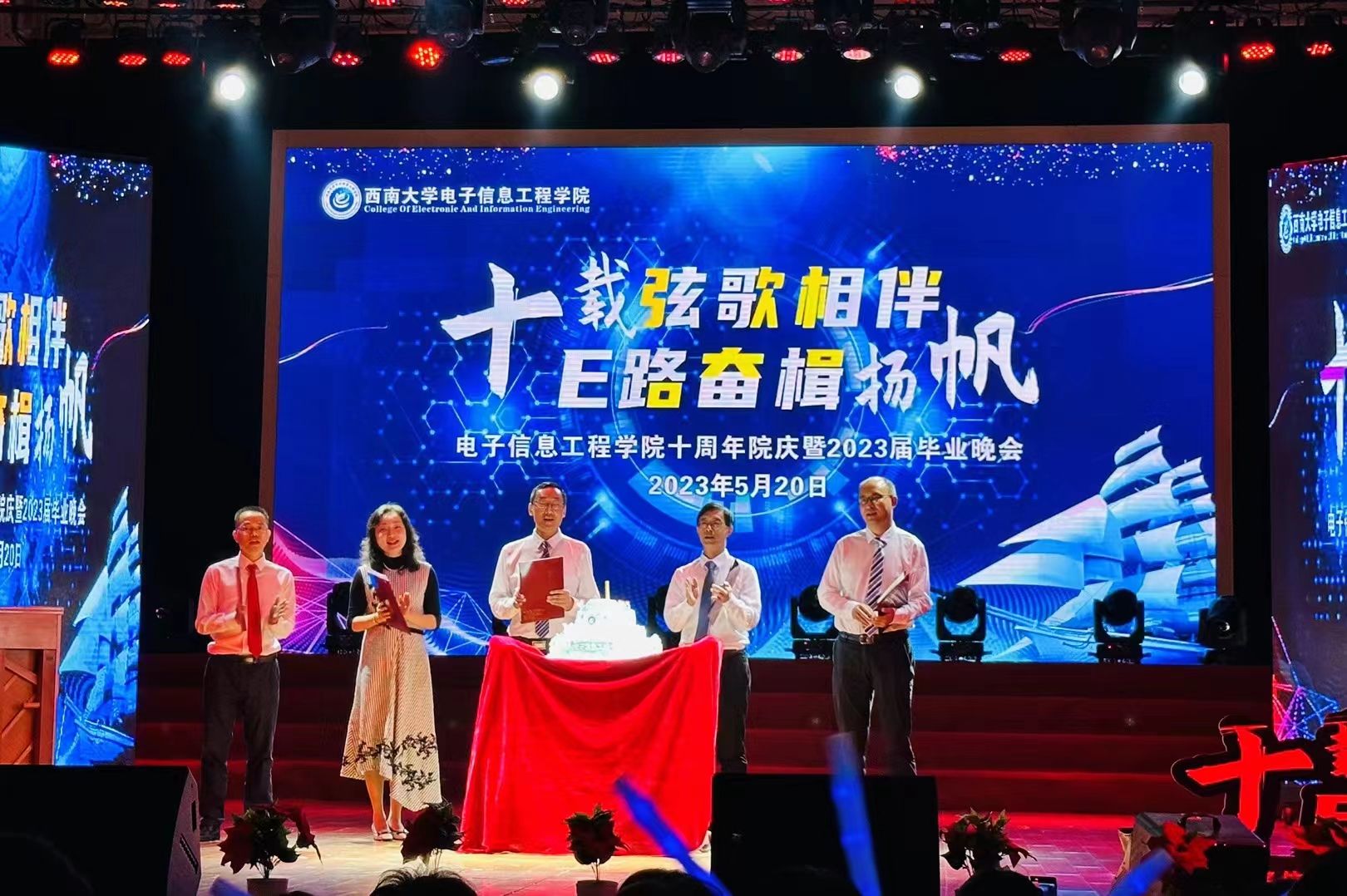 5月20日,电子信息工程学院“十载弦歌相伴 E路奋楫扬帆”十周年院庆暨2023届毕业晚会在光大礼堂成功举办。学院党委书记熊海灵、院长李传东、原党委书记毕均明、党委副书记、纪委书记谢俪、副院长解宜原、李华青、办公室主任高渤、信息安全系主任王慧维、实验中心主任刘东卓、学工办主任张颜、教学办公室主任何沐曦、2019级辅导员余琼以及学院师生等800余人观看晚会。
