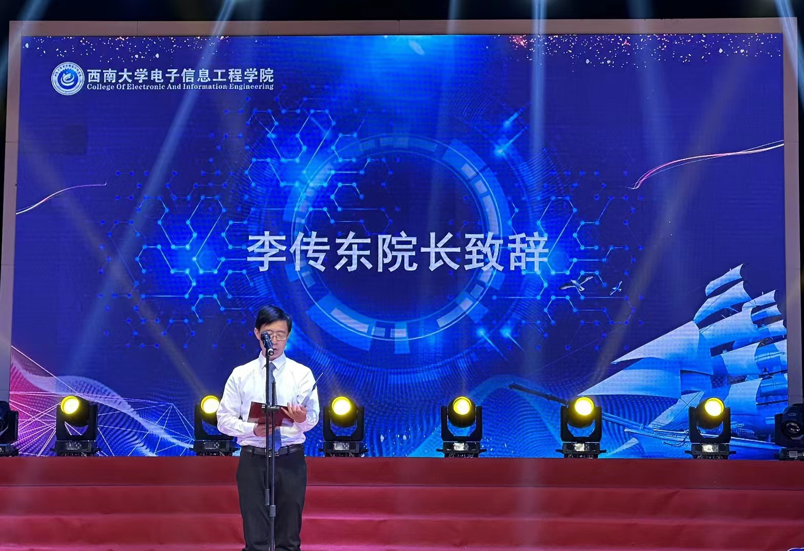 活动伊始,李传东院长总结了电子信息工程学院组建十年来栉风沐雨,奋勇前行取得的辉煌成就,祝愿学院在下一个十年再接再厉,再创辉煌。