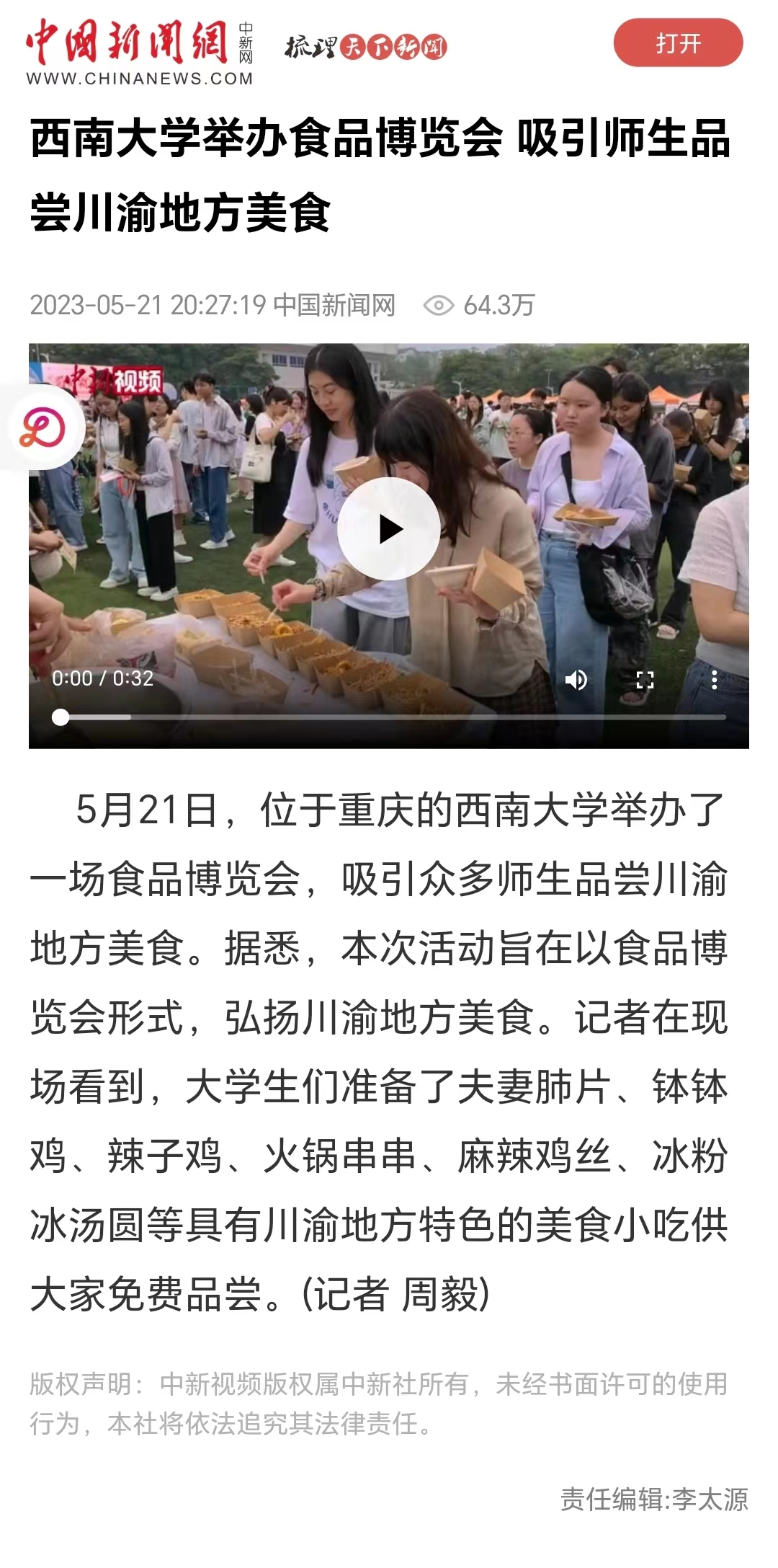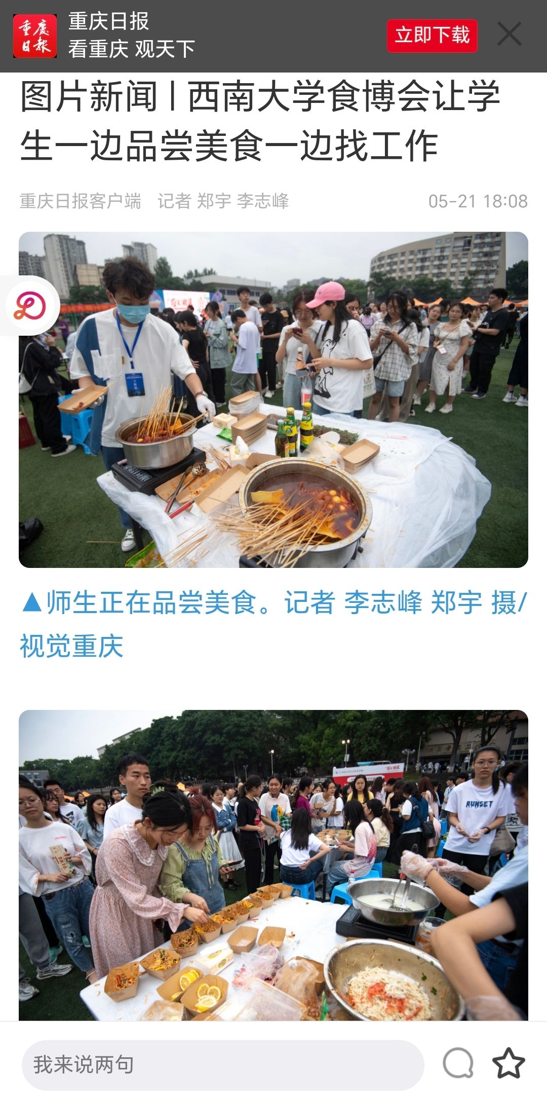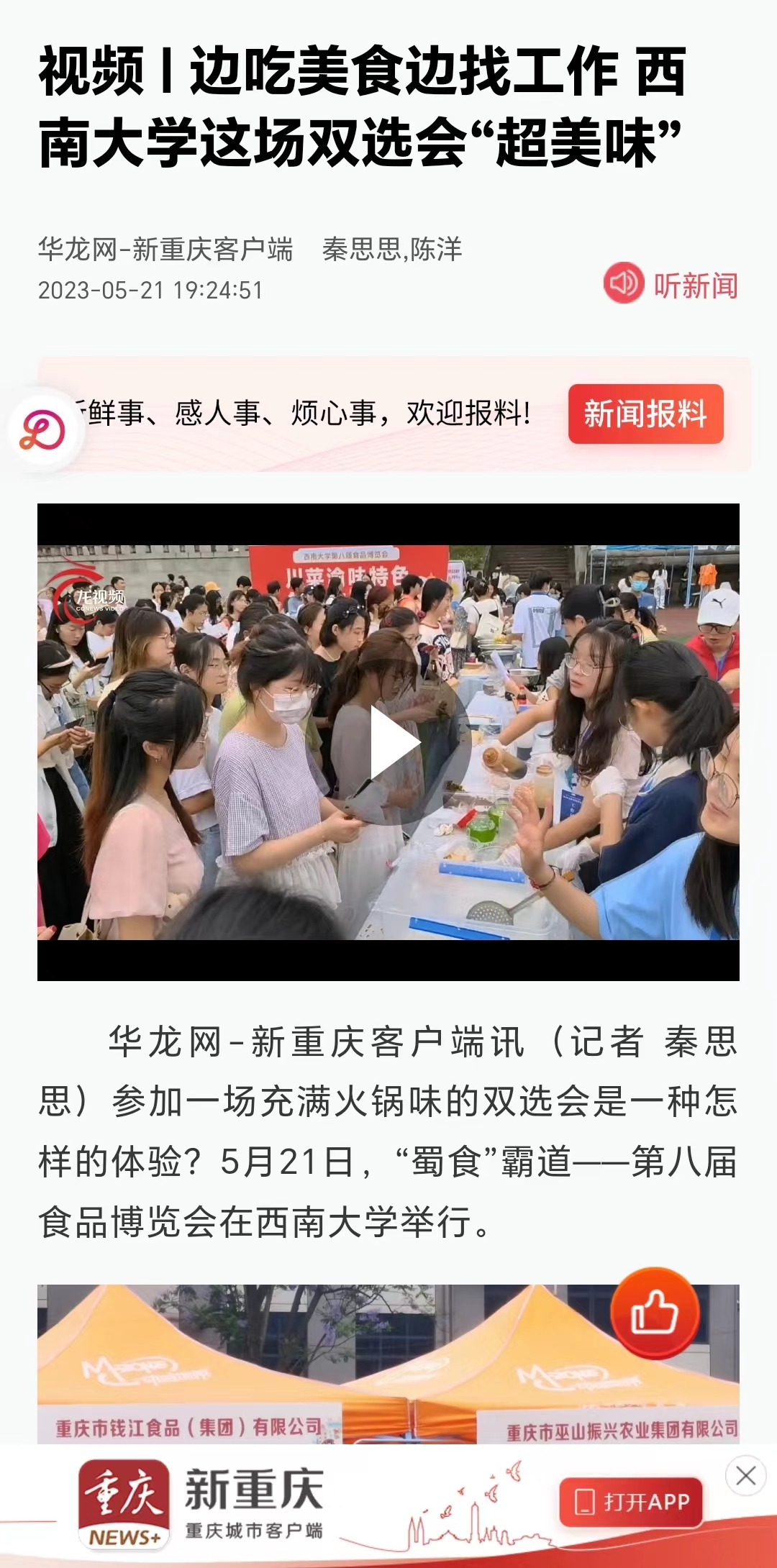 食品博览会不仅是一场川渝美食盛宴,更是一个集美食文化展示、校企合作、人才交流以及招聘就业于一体的全校性盛会。为全校师生提供一个了解川渝美食文化的平台,让同学们不仅体验到了川渝特色美食文化,还了解到了食品前沿科技发展。同时此次活动也呼吁众多西大学子共用手中的食材和学习的知识,以西大学子独特的创造力,展示“蜀食”霸道独特的风采。