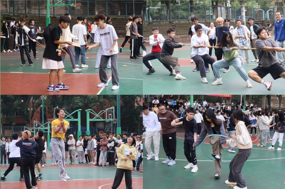本次趣味运动会以创新的趣味活动为主,既有团队协作的接力比赛,也有个人技巧的单项比赛,包含听歌识曲、智传呼啦圈、“心心相印”螃蟹赛跑、扔沙包、颠球接力、拔河共六个项目。“听歌识曲”中,同学们手牵手,肩并肩,奋力争夺话筒,享受运动乐趣;集体项目中,各个参赛队伍团结一致,奋力拼搏:智传呼啦圈节奏紧张,争分夺秒赢胜利;“心心相印”螃蟹跑项目中,同学们手挽手,背靠背,步调一致奔向终点;颠球接力项目中,同学们掌握节奏,齐心协力;拔河比赛现场,全场观众欢呼声助威声此起彼伏,运动员们摩拳擦掌、一决胜负。现场精彩不断,氛围热烈。