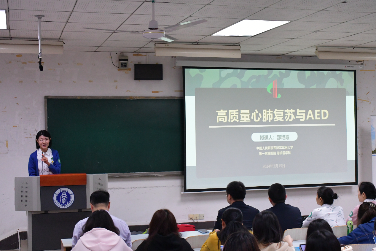 急救部护士长邵艳霞围绕高质量心肺复苏术与“救命神器”AED的分析和使用作了现场讲解。她结合生活中的真实案例、动画视频向同学们讲解了心肺复苏的诊断、救护方法,并现场演示了“救命神器”AED自动体外除颤仪的详细使用。邵护士长鼓励同学们遇到突发情况时能勇敢地按下双手实施救助,她表示,2021年1月1日起正式施行的《中华人民共和国民法典》第一百八十四条规定:因自愿实施紧急救助行为造成受助人损害的,救助人不承担民事责任,见义勇为不仅是道德导向,更有法可依。