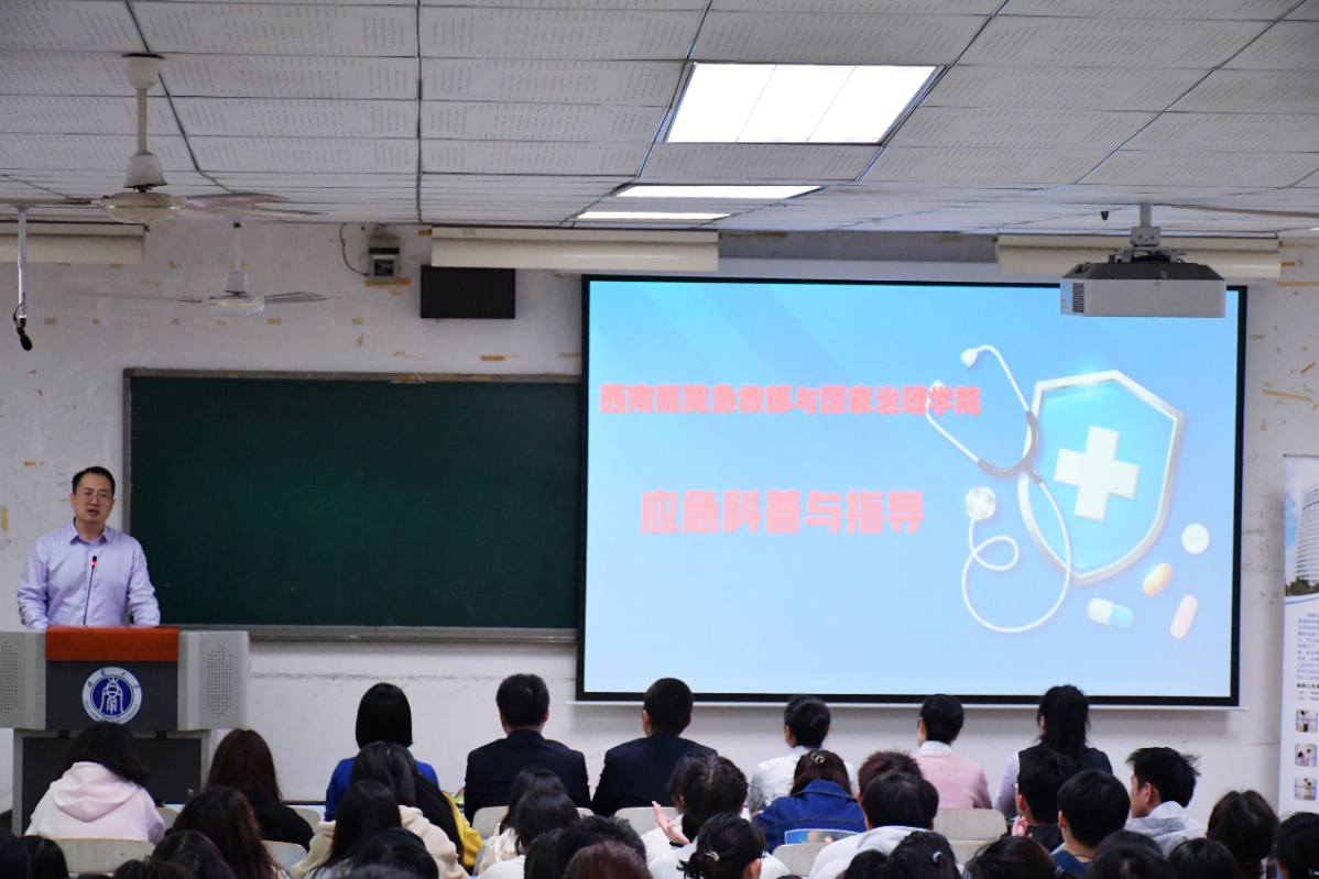 为推进党史学习教育,弘扬红色军医精神,普及医疗急救知识,提高学生健康素养,指导师生就医急诊急救,3月15日,国家治理学院与解放军陆军军医大学第一附属医院西南医院急救部联合开展“我为师生办实事”校园急救科普与就诊指导活动。西南医院急救部邵艳霞、陈小雄、张军等医护人员,学院全体辅导员、本科生共300余人一同参加,学院党委副书记李长松主持讲座。