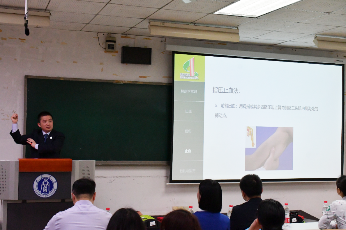 急救部前区负责人陈小雄围绕蛇犬咬伤、毒虫蜇伤等常见意外伤情,对紧急处理方法进行了讲解。结合西南地区蛇虫种类与数量繁多的实际情况,陈医生图文并茂讲解了各类蛇虫咬伤后的处理方法,针对重庆地区蛇虫分布他还指导同学们重点学习了几种常见毒蛇的识别、规避和咬伤紧急处理方法。