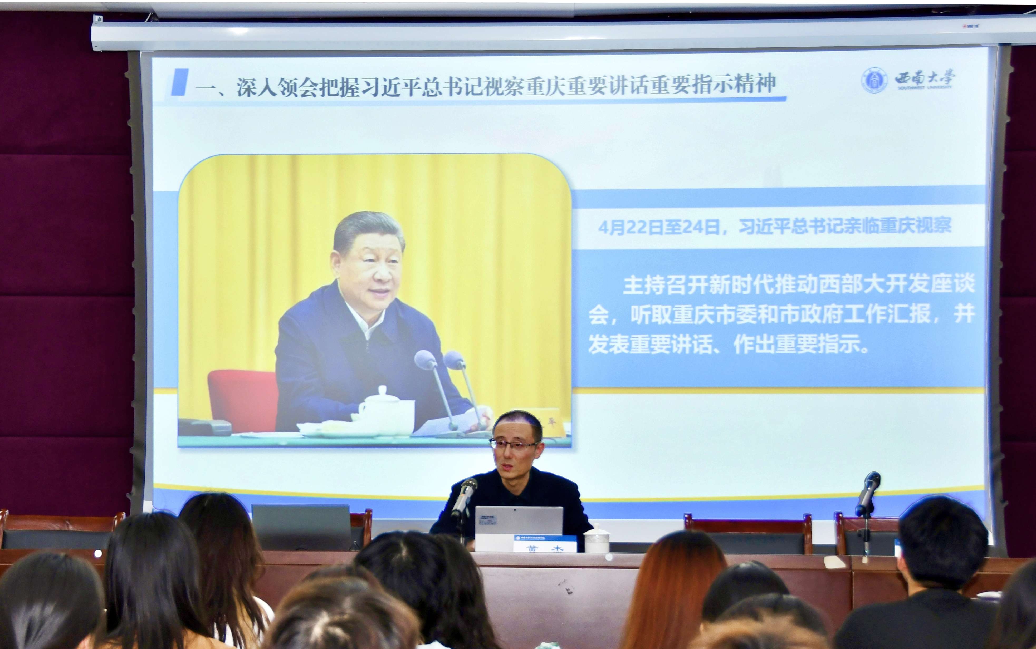 黄杰从“五个深刻领会把握”全面系统地向同学们讲解阐述了习近平总书记视察重庆重要讲话重要指示精神,从历史、现实、未来的角度梳理讲解了学校乡村建设的历史源头与早期探索、新中国成立后服务“三农”工作的行动实践、新时代助力乡村全面振兴的担当作为,并深情寄语同学们要做创新引领的排头兵、实践报国的先锋队、建功一线的生力军。授课旁征博引、深入浅出、系统宏观,既有理论深度,又有思想高度,极富吸引力、感染力,为在座的同学们带来了一场精彩的“思想政治理论盛宴”。