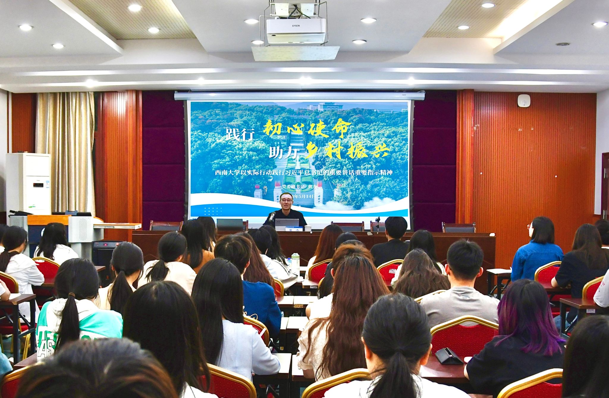 为全面贯彻落实习近平总书记关于教育的重要论述,深入学习贯彻习近平总书记视察重庆重要讲话重要指示精神,5月14日晚,学校党委副书记黄杰莅临国家治理学院为本科生讲授《践行初心使命 助力乡村振兴》思政大课。国家治理学院党委书记刘勇、党委副书记李长松、辅导员史丽参加。
