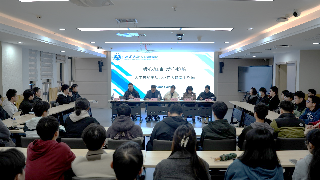 研途送温暖,助力考研梦。在2025研究生入学考试即将到来之际,为鼓舞学生考研士气,增强学生考研信心,人工智能学院于11月26日下午举行了2025届考研学生慰问活动。学院党委书记夏俊,党委副书记、纪委书记张维薇,学院学工办主任张放,教学办主任黄山,本科生辅导员孙一博、汪易玲参加座谈会,会议由张维薇副书记主持。