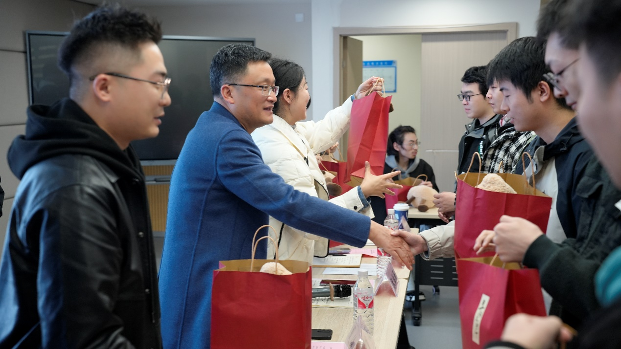 交流结束后,学院领导、老师向考研学生赠送“考研加油包”。花生玩偶寓意“好事发生”,旺仔牛奶寓意万事兴旺,文具套装为学子们提供便利与支持,饱含学院的深切关爱与殷切期望。同学们高举玩偶,共同留下了珍贵的合影。
