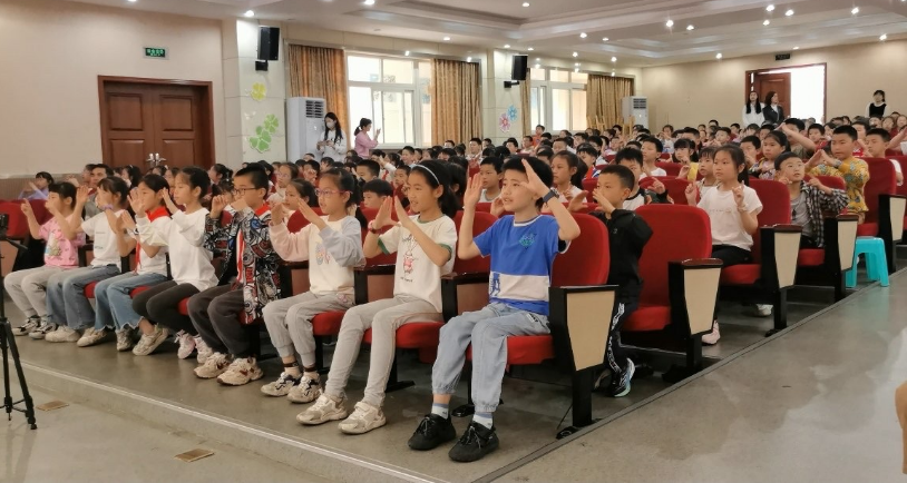 “民族团结手语舞”环节,少数民族小姐姐带领全体小学生共学《爱我中华》手语舞。孩子们目不转睛地紧盯模仿,随着音乐响起,330余双小手随旋律起伏,共同演绎“五十六个民族五十六朵花,五十六族兄弟姐妹是一家”的温暖场景。手语舞结束,大家齐声喊出“民族团结一家亲,爱我中华”的响亮口号。