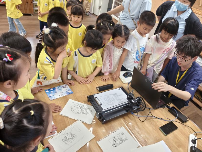 画画机器人区更是吸引了众多小朋友的目光,只见机器人在纸上灵活地挥舞着画笔,不一会儿就绘制出了一个个经典人物:奥特曼、美人鱼、艾莎公主、海绵宝宝……,小朋友们惊叹不已,纷纷围在机器人周围,好奇地观察着它的每一个动作。