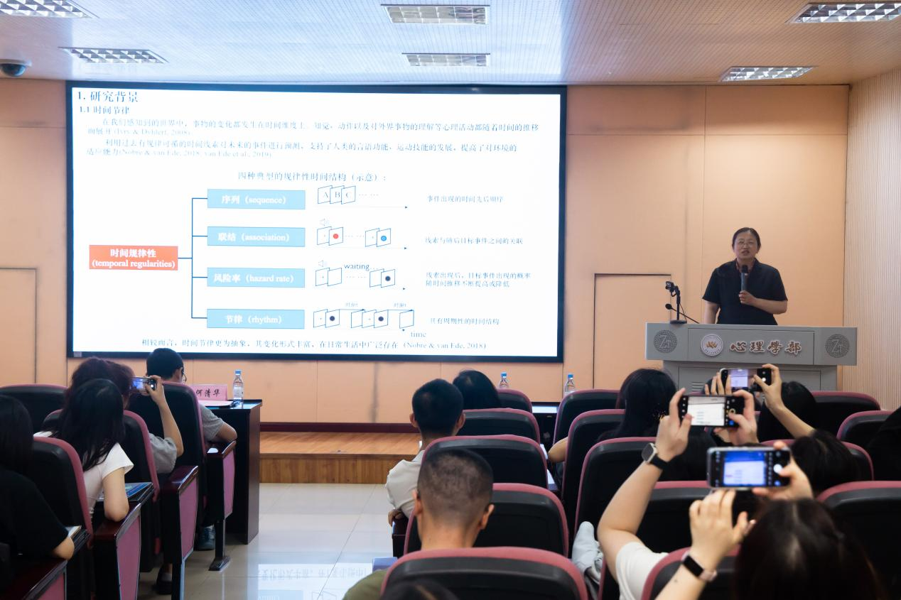 白学军教授、沈模卫教授、郭秀艳教授、游旭群教授、傅小兰教授、刘力教授、张明教授先后围绕“从‘耐挫’到‘反败为胜’:新时代个体心理健康的核心素质的探讨”“审美客体心理表征的认知加工机制”“时间节律的内隐学习研究”“立德树人教育智慧大模型构建的实践路径:基于中国心理学自主知识体系的思考”“微表情与伪装表情研究”“面向重大社会现实问题的社会心理学研究”“人类的注意抑制:返回抑制研究”等作专题报告,分享前沿的学术成果与研究方法,受到参会师生热烈关注。