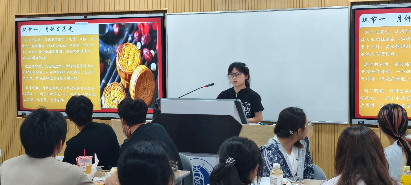 活动伊始,任老师开场致辞,活跃气氛。然后由班委为同学们讲解了中秋节的由来及月饼的发展历史。从唐代的“胡饼”到明代的“团圆饼”,月饼不仅是传统节令食品,更承载着深厚的文化内涵。同学们在聆听中感受到了中华饮食文化的源远流长,了解到食品人所需要具备的专业知识与责任担当。