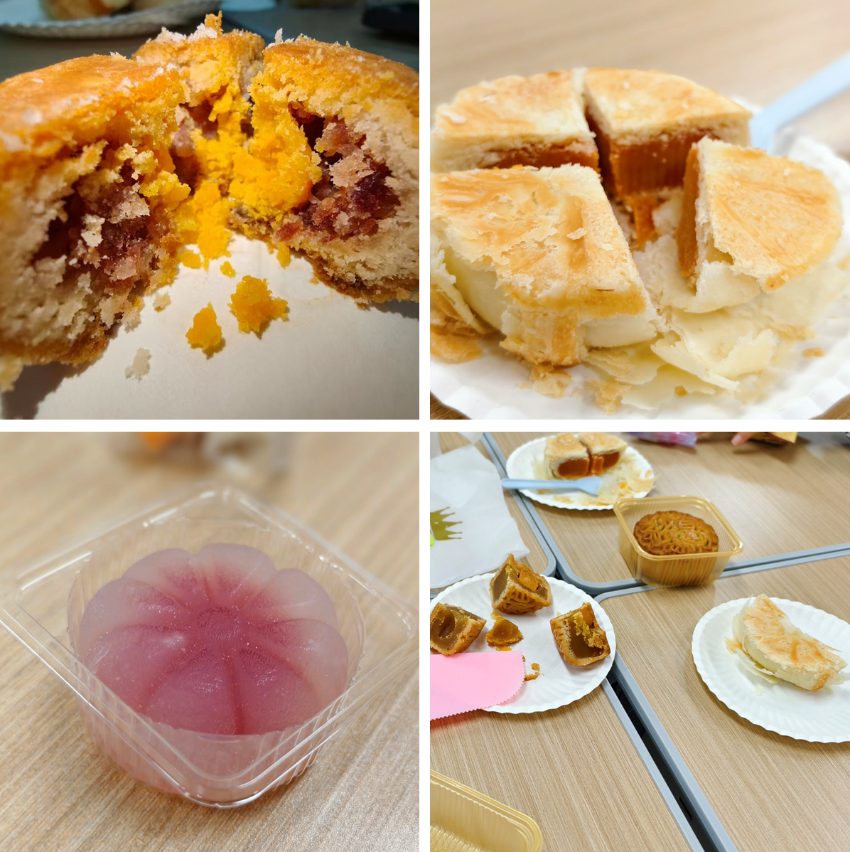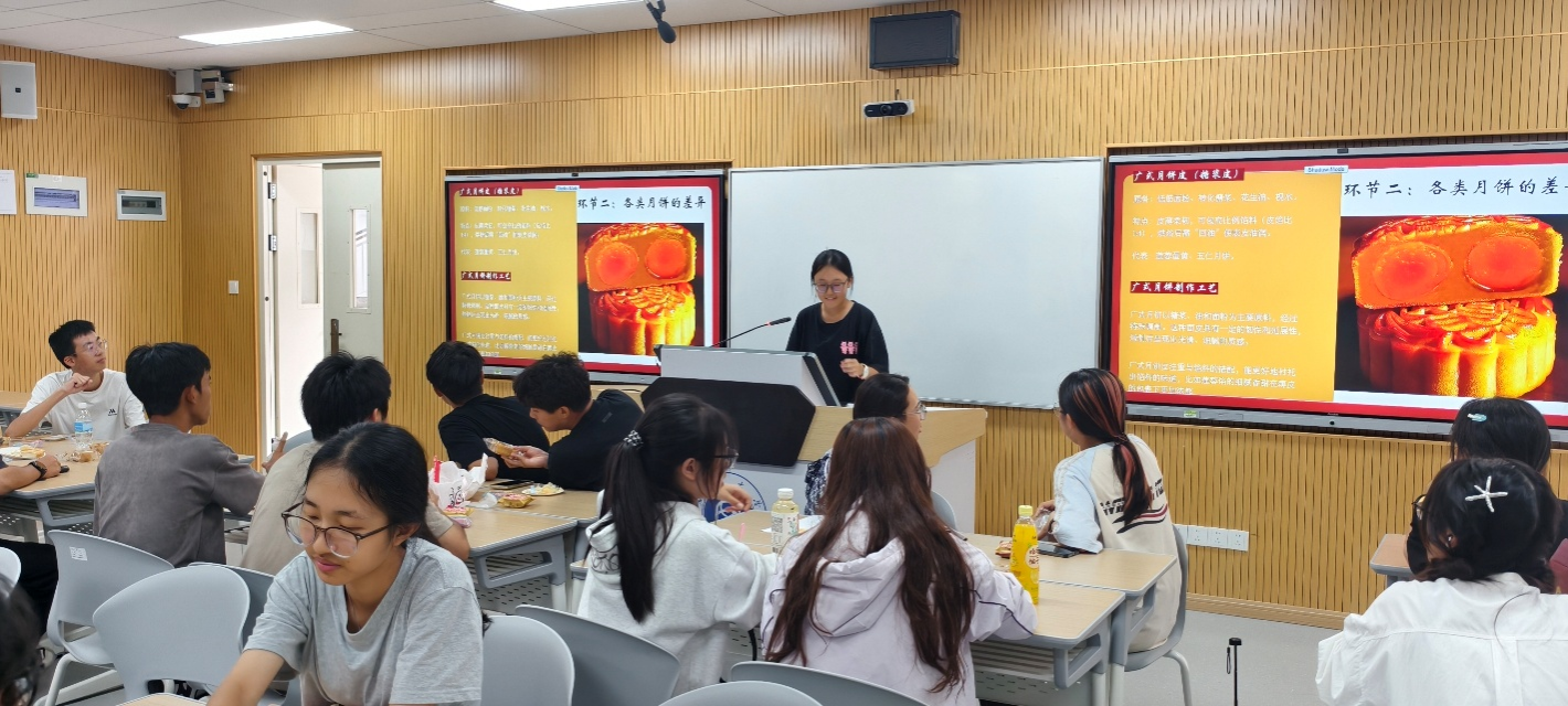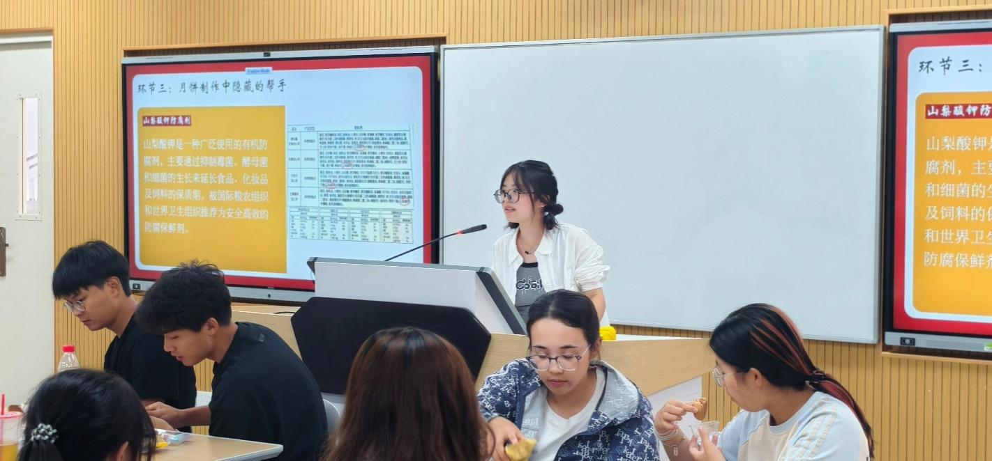 随后,活动进入月饼品鉴与科普环节。由班委为同学们详细地介绍了广式、苏式、冰皮等不同月饼的饼皮特点及制作工艺,广式月饼的糖浆皮薄馅大,苏式月饼的酥皮层次分明,冰皮月饼的软糯清凉,让同学们在味觉体验中直观感受食品工艺的差异。并结合食品科学知识,讲解了山梨酸钾等食品添加剂的作用,用轻松幽默的语言解释了防腐剂在食品保鲜中的重要地位。同学们在品尝各类月饼的同时,也学习了其背后的科学原理,实现了“品”与“学”的结合。