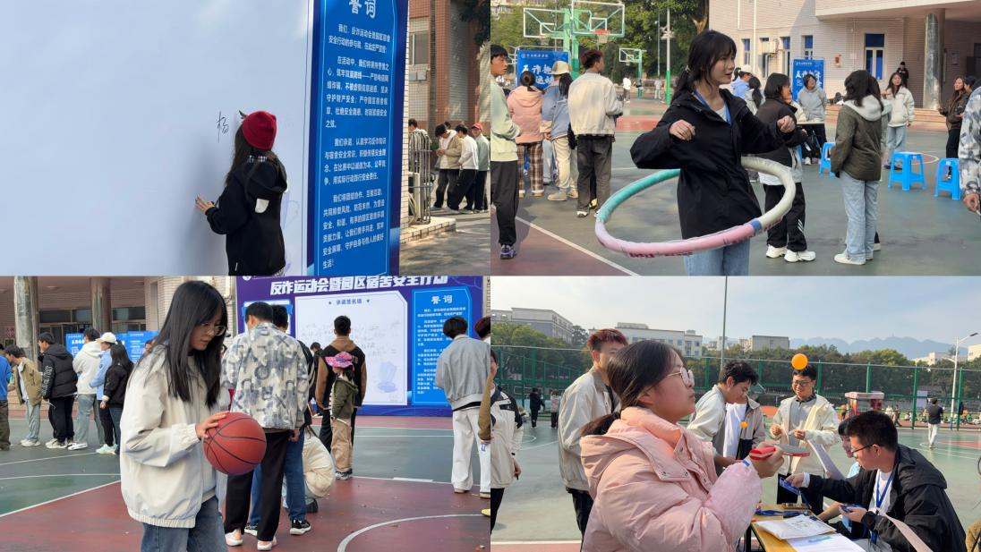 整个活动寓教于乐,精彩纷呈。全体同学高举右拳集体进行反诈宣誓,让反诈意识入脑入心;在反诈签名墙上签名,以落笔为诺的方式筑牢安全意识防线;转呼啦圈时同步进行反诈问答、乒乓球台前快速识别骗局特征、拍篮球时说出宿舍安全注意事项,让同学们在动静之间轻松掌握反诈和宿舍安全知识。