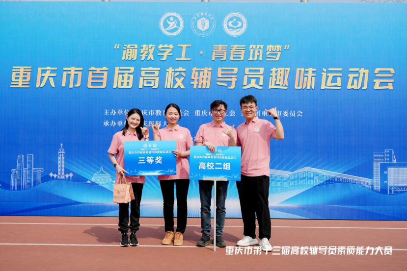 在随后举行的“渝教学工·青春筑梦”重庆市首届高校辅导员趣味运动会中,学校辅导员在赛场上团结协作、奋力拼搏,所在的高校二组获得三等奖。