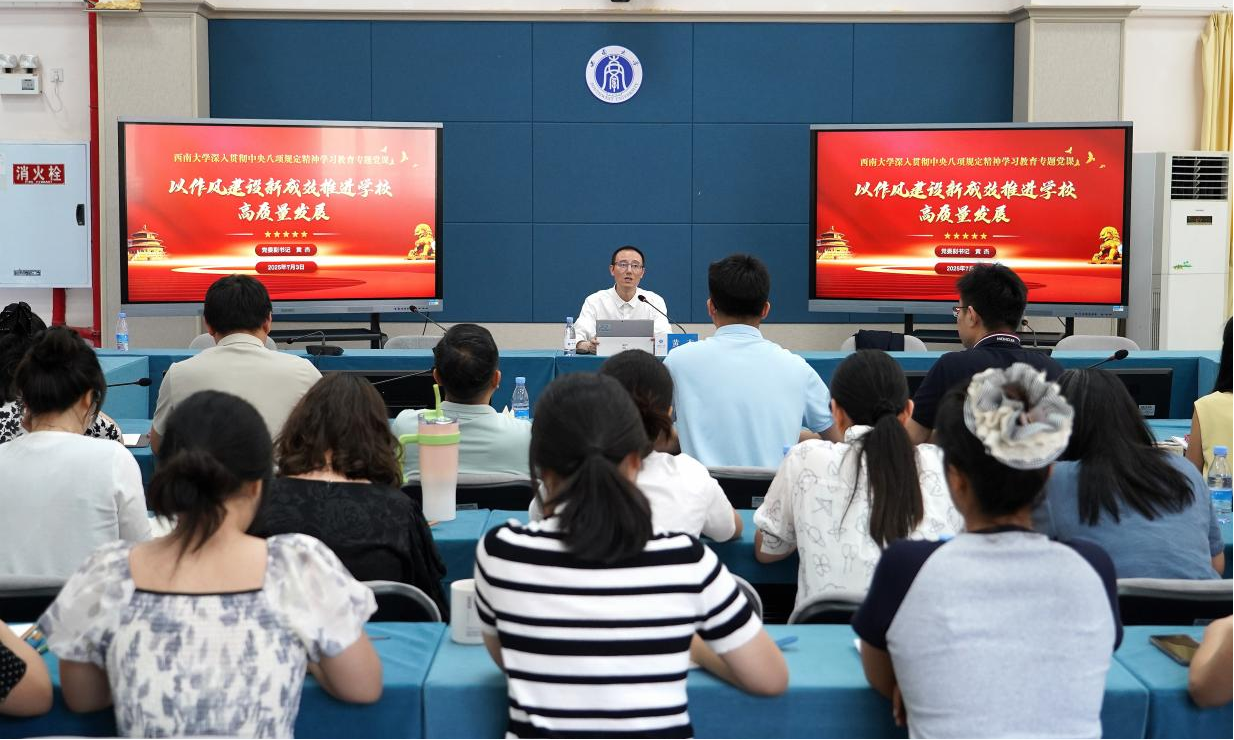 为扎实推进深入贯彻中央八项规定精神学习教育,持续加强作风建设,7月3日下午,校党委副书记黄杰在第二学生活动中心420会议室为学生工作处党支部讲授《以作风建设新成效推进学校高质量发展》专题党课,党支部书记许克松主持,全体党员干部参加。黄杰围绕筑牢思想根基、铸就新风正气、构建长效机制三个方面,结合高等教育领域和我校典型案例,全面阐述了中央八项规定精神的深远意义,精准点明了当前在贯彻执行中存在的主要问题与薄弱环节,强调党员干部要从理论、实践、价值等维度出发,全面贯彻中央八项规定精神,以作风建设实绩实效推动学校各项事业高质量发展。