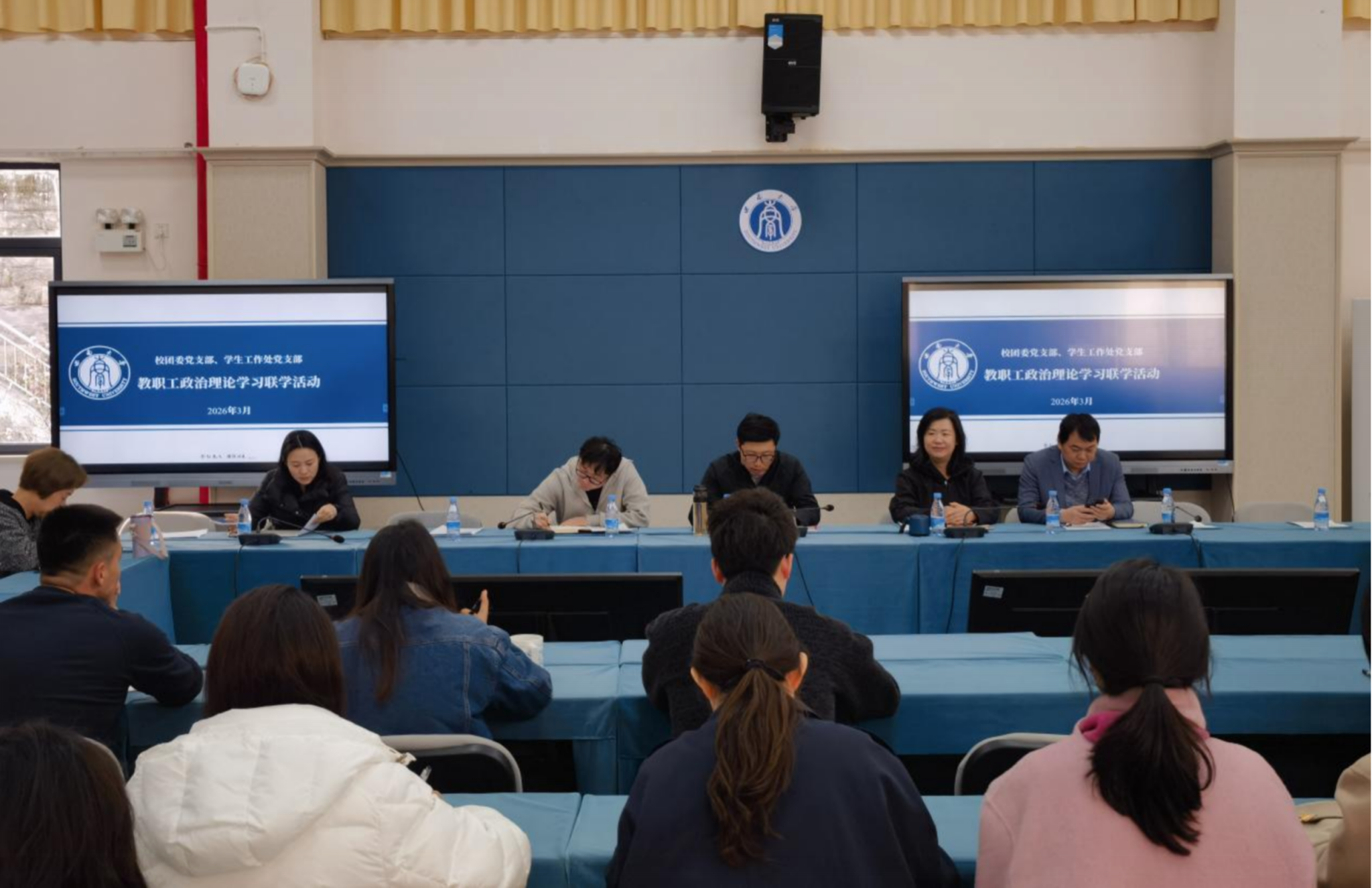 3月5日,党委学生工作部、校团委在第二学生活动中心420会议室联合开展2026年第二次教职工政治理论学习。校团委书记、党委学生工作部副部长(兼)于涛同志主持学习活动。刘润同志领学了中共中央政治局会议精神、习近平总书记在中共中央政治局第二十四次集体学习时的重要讲话精神。刘丹同志领学了《求是》杂志发表的习近平总书记重要文章《当前经济工作的重点任务》。全体教职工观看学校师生服务中心推介视频,以及学习贯彻党的二十届四中全会精神培训课程《“十五五”时期经济社会发展的指导思想、重大原则和根本保证》。罗军、刘英慧、孙漫丽结合工作实际分享学习心得体会。