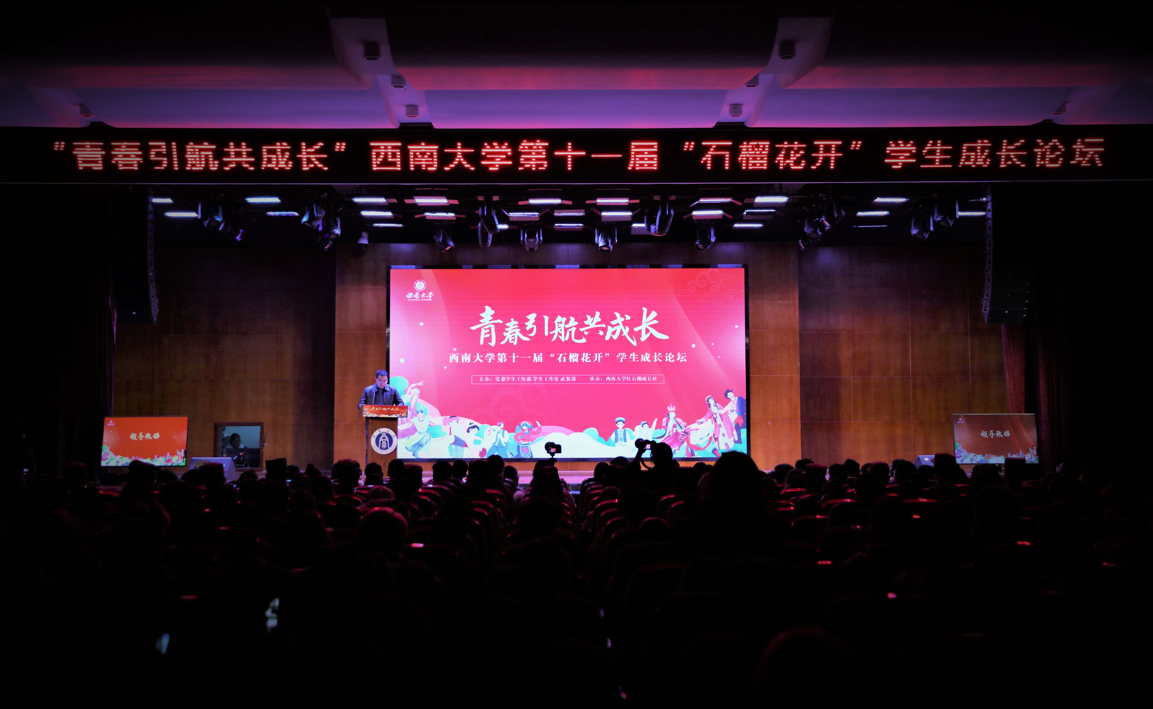 青春引航共成长,团结奋进铸辉煌。12月3日晚,学校第十一届“石榴花开”学生成长论坛在第二学生活动中心顺利举行,来自四十多个民族的500余名同学参加活动。