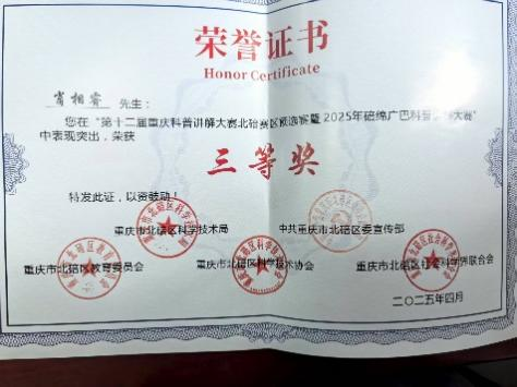 赛事驱动方面,连续三年举办“科技创新,科学普及”等主题科普讲解大赛,从院级赛事升级为校级赛事,推选选手参与北碚区科普讲解大赛,斩获二等奖2项、三等奖2项、优秀奖3项,以赛促学提升学生科普传播能力。